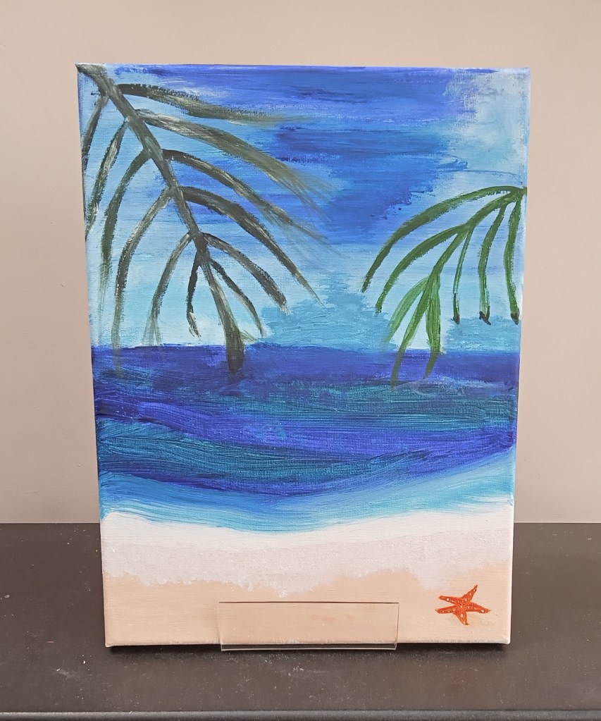Chloe helped me to banish many of my artistic self-doubts the other night. Her energy and encouragement were infectious and fizzed around the room as she squirted white, peach and jewel green and blue whorls of paint on our paper plate palettes. She used a dot-to-dot method of painting each section of a Caribbean Island beach on her canvas, then waited while we copied them onto ours, cheerfully tweaking our mistakes with a flick of her paintbrush.
